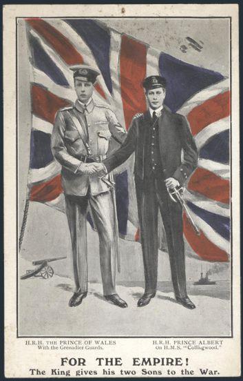 postcard circa 1915 depicting THE PRINCE OF WALES and PRINCE ALBERT standing together with Union Jack behind plus biplane, naval ship & canon. Entitled "FOR THE EMPIRE! THE KING GIVES HIS TWO SONS TO THE WAR!". F, pinhole at top (Image)