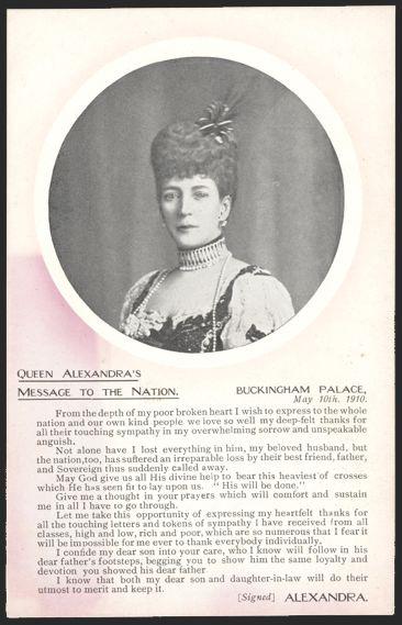 postcard with a portrait of QUEEN ALEXANDRA & her 10 May, 1910 message to the Nation following the death of her husband KING EDWARD VII. F. Unusual item (Image)