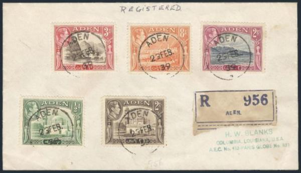 1364 16/25 image16/25, Five diff KGVI issues neatly tied by Aden 23 Feb, 1939 CDS's on Reg'd cover to USA. F (Image) Estimate 40.00+ $Cdn