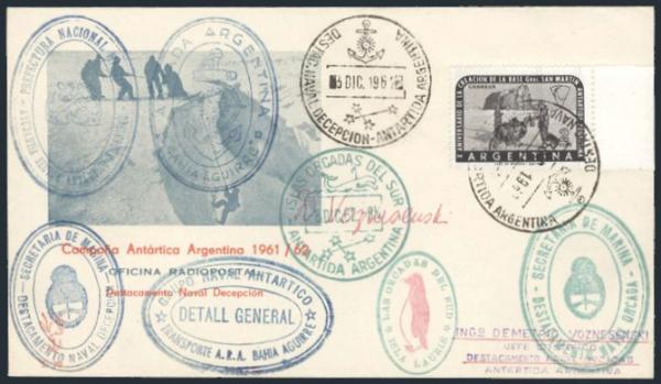 1424 731 image731, Tied by 3 Dec 1962 CDS on cacheted ANTARCTICA cover. Has 12 diff handstamps on the front and reverse plus 2 diff signatures. VF (Image) Estimate 75.00+ $Cdn
