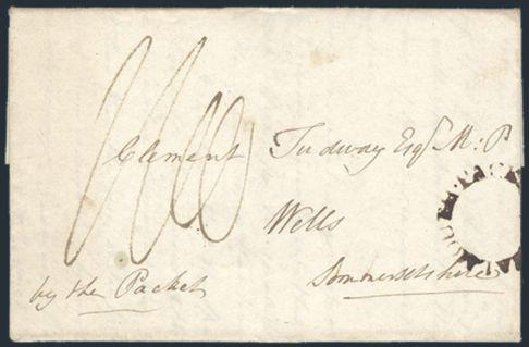 1410   imageStampless folded letter datelined Antigua 5 March, 1809 addr to Sommershire, England, rated "1/1" in with "by the Packet" in m/s. Has black brown "FALMOUTH PACKET" h/s. VF (Image) Estimate 200.00+ $Cdn