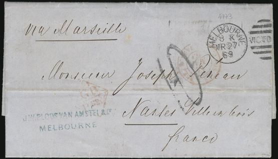 1446   imageStampless entire from Melbourne 27 Mr 1869 to Nantes France (rec b/s 15 May 1869). Has various transit markings incl large "10", J.W. Ploos Van Amstel & Co. Melbourne h/s, m/s "via Marseille", etc. F-VF (Image) Estimate 135.00+ $Cdn
