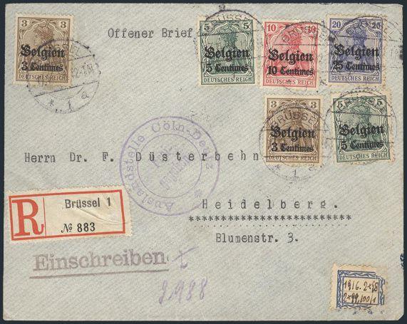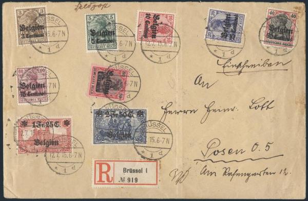 Complete WWI German Occupation set tied by Brussels 12 July 1915 CDS's on Reg'd cover to Posen, Germany. F, vert fold does not affect stamps (Image)