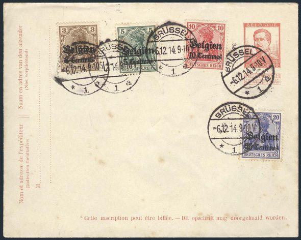 by Brussels 6 Dec 1914 CDS's of Belgian 10¢ Postal Stationery envelope. Interesting German Occupation item. VF, a few light TS spots. Unaddr (Image)