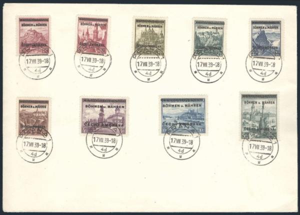 1797 1-19 image1-19, German Protectorate complete set to 10K tied by Prague 17 July 1939 CDS on 2 unaddr covers. VF. Scarce (2) (Image) Estimate 125.00+ $Cdn