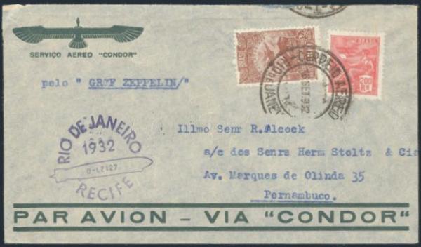 1810 334, C21 image334, C21, Tied on cach GRAF ZEPPELIN 5th South America Sept 1932 Flight cover Rio de Janeiro to Recife leg, addr to Pernambuco. F-VF, slightly reduced (Image) Estimate 90.00+ $Cdn