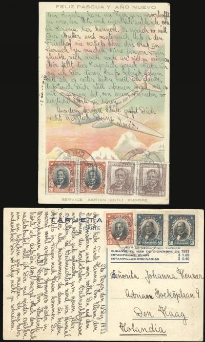 1936 181, C16, C19 image181 (2), C16 (3), C19 (2), Tied (on front & reverse) by 1933 CDS's on pretty illustrated airmail postcard to Holland. F (Image) Estimate 50.00+ $Cdn