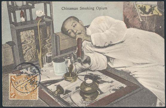 1939 111 image111, Tied by Shanghai 4 Nov 1910 CDS on multi-coloured postcard depicting a Chinese man SMOKING OPIUM. F (Image) Estimate 65.00+ $Cdn
