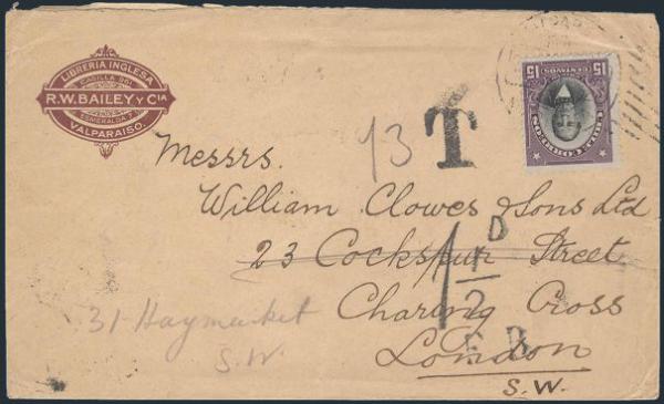 1931 68, 104 image68 (Strip of 5), 104, Tied front & back by Valparaiso 1914 duplex cancel on UNDERPAID commercial cover to London (redirected within the city). Has a variety of postage due markings, etc & fancy R.W. Bailey & Co. corner card. F. Attractive (Image) Estimate 50.00+ $Cdn