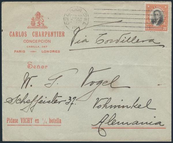1934 105 image105, Tied by Concepcion 20 Feb 1914 cancel on front & full back red illustrated advertising cover for Carlos Charpentier. Depicts carrying case for toiletries, etc. F, cover fold. Attractive (Image) Estimate 45.00+ $Cdn