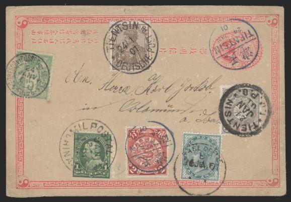 1940 112 image112, Tied on 1¢ red Postal Stationery card by Tientsin 24 Jan 1901 CDS to Germany ALSO franked by 5 other issues from France, Germany, India, Japan & USA; each tied by appropriate same day Foreign Office CDS (India QV issue tied British strike). Extraordinary BOXER REBELLION era franking. F, slight cover toning. A SPECTACULAR ITEM! (Image) Estimate 325.00+ $Cdn