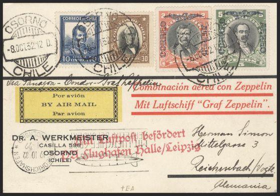 1935 168, C11, C13 image168, C11, C13, etc, Tied by Osorno 8 Oct, 1932 CDS's on cach GRAF ZEPPELIN flight cover to Germany. Has Friedrichshafen 19 Oct, 1932 illustrated rec cancel. VF (Image) Estimate 250.00+ $Cdn
