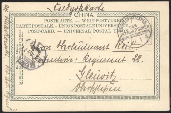 1945   imageStampless German trilingual b/s photo postcard 1901 from the BOXER REBELLION era with "K.D. FELDPOSTEXPED / DES / OSTASIATISCHEN / EXPEDITIONSCORPS / 11 Jan" cancel. Addr to Gleiwitz, Germany (27 Feb b/s). Card depicts the German Clubhouse, Tientsin. F-VF, slight vertical centre crease. Attractive item (Image) Estimate 200.00+ $Cdn