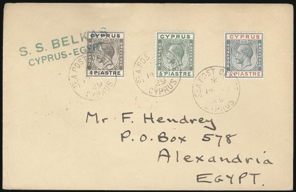 1999 89 image89, 91, 93, Tied by Sea Post Office Cyprus 14 Aug 1929 CDS's on S.S. BELKAS CYPRUS TO EGYPT Ship cover. Has b/s's from Alexandria & Port Said. VF (Image) Estimate 75.00+ $Cdn