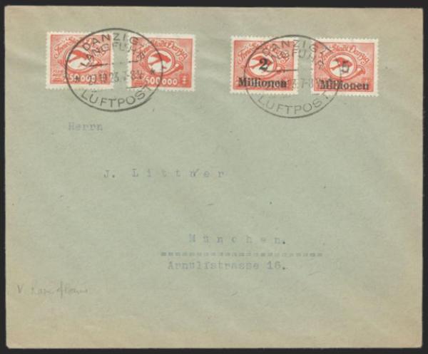 2050 C22-5 imageC22-5, Tied by "Danzig / Langfuhr / Luftpost" 27 Oct 1923 oval cancels on INFLATION Airmail cover to Munich. The stamps pay 7,750,000 mark rate! VF, some edge toning in cover (Image) Estimate 125.00+ $Cdn