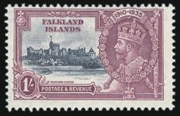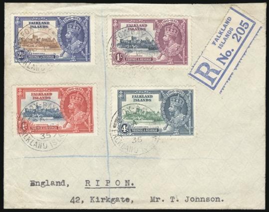 Silver Jubilee set tied by Fox Bay 18 Sept 1935 CDS's on Reg'd cover to England. F (Image)