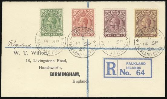 Four diff KGV issues all tied by Port Stanley 14 Sep 1926 CDS cancels on an attractive Reg'd "Wilson" cover to Birmingham England. VF (Image)
