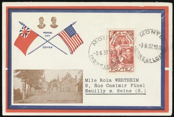 2331 B46 imageB46, Tied by Monts 3 June 1937 CDS's on colour cach Wedding day of EDWARD VIII AND WALLIS SIMPSON commemorative cover to Neuilly. Depicts the couple, American flag and Red Ensign along with view of the Chateau de Cande. VF (Image) Estimate 50.00+ $Cdn