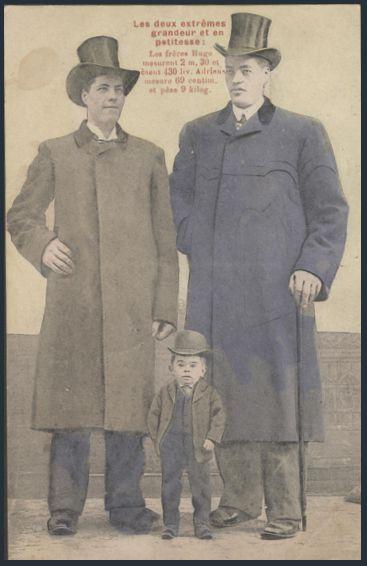 postcard circa 1910 depicting the giant HUGO BROTHERS standing behind a dwarf man. The Hugo's were famous giants (over 7 feet, 5 inches) & traveled the world appearing at fairs & circus. F, some soiling (Image)
