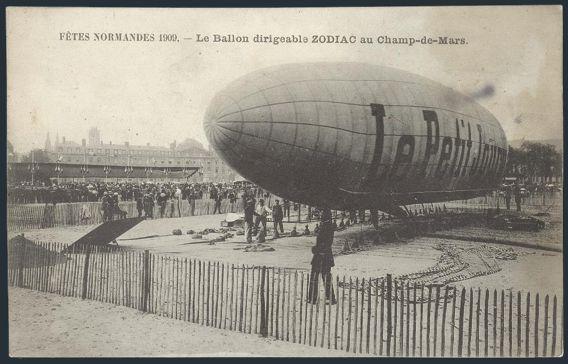 postcard from 1909 depicting the Dirigible 'ZODIAC'. This was a class of airships that were built for the French Army. VF, minor edge stain (Image)