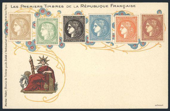 unused postcards pre 1910 depicting the first issues of France in full colour. One depicts 6 diff Ceres stamps, the other 6 diff Napoleon issues. Each with nice crest. VF
