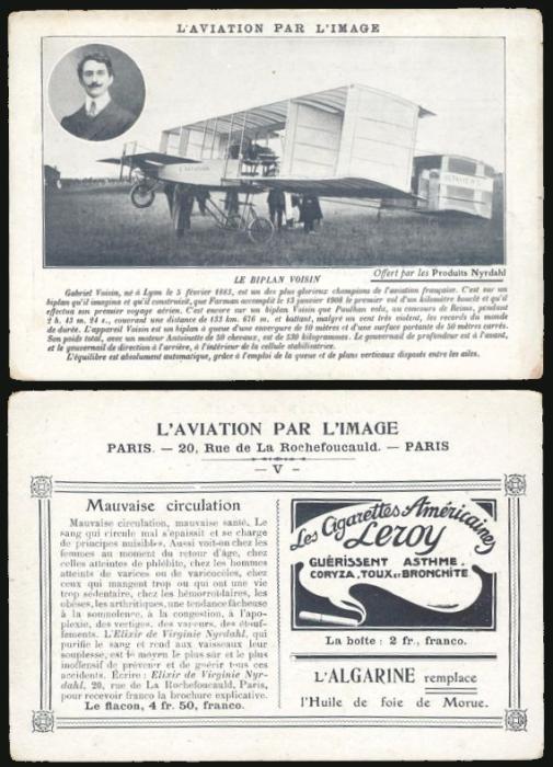 collector's card circa 1910 (postcard size) for Leroy American Cigarettes. Depicts a photo & write-up of the VOISIN BIPLANE. A nice pioneer aviation item. F (Image)