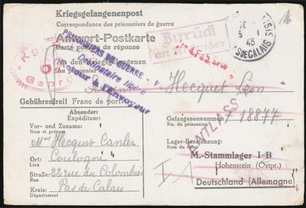 POW reply card to French prisoner in Stalag IB, Hohenstein, Germany from Coulogne, Pas de Calais 5 Jan 1943. RETURNED with RELEASED h/s's in French & German, Camp censor, etc. F (Image)