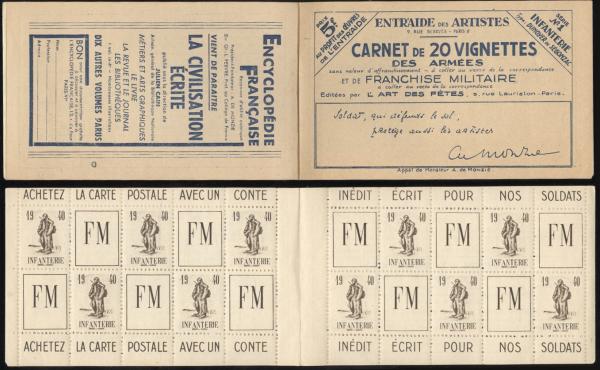 INFANTRY COMPLETE BOOKLET containing 20 se-tenant military label stamps, designed by the painter Andre Dunoyer de Segonzac. VF, NH, tiny flaw in back cover (Image)