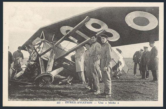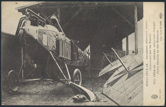 b/w postcard 1915 depicting a GERMAN FIGHTER PLANE which was brought down by the Russians. The postcard was printed in France. F. Scarce (Image)