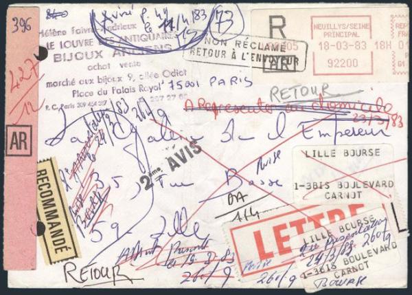 A&R/Registered cover from Paris with meter label 18 Mar 1983 to Lille Boarse / Carnot. UNDELIVERED & redirected with a multitude of cancels, h/s's, labels & m/s notations front & back. F, centre fold. Eye-catching item of modern postal