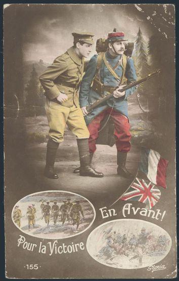 diff WWI Patriotic postcards from 1916 depicting French & British Soldier, flags, cannon, etc. All with messages on reverse with one having been mailed by a soldier. F (3)