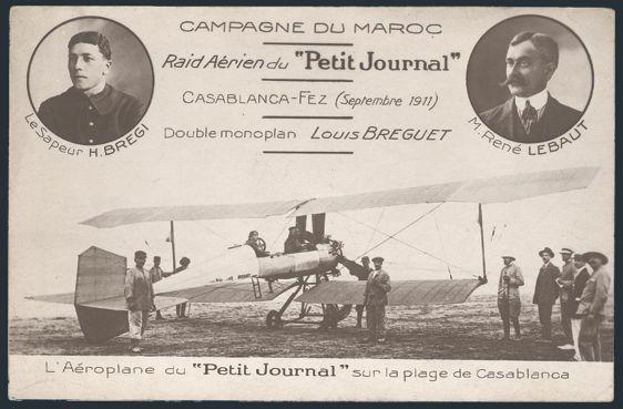 2434   imageUnused b/w real photo postcard depicting the early biplane "LOUIS BREGUET" which flew from Casablanca to Fez in Sept 1911. Shows the plane, ground crew, bystanders along with the 2 pilots. F. VERY SCARCE EARLY AVIATION POSTCARD (Image) Estimate 150.00+ $Cdn