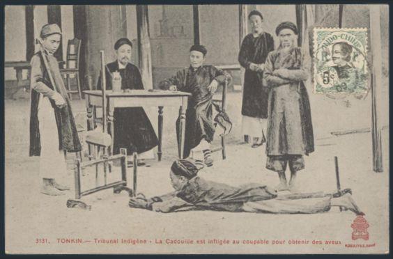 2595 44 image44, Tied on two diff b/w postcards written from Hanoi 1909. Each shows a diff indigenous tribunal court with PRISONERS IN STOCKS / CHAINS. VF (2) (Image) Estimate 75.00+ $Cdn