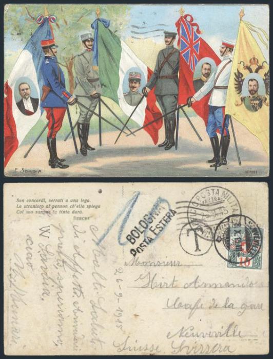 WWI colour Patriotic postcard with MPO 26 Sept 1915 CDS to Switzerland. Has 10¢ Postage Due tied by Neuveville 8 Oct receiver. Depicts Leaders, Flags & Soldiers in uniform from Russia, Gr. Britain, Italy & France. F-VF. Attractive (Image)