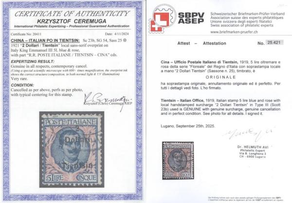 2757 23b image23b, Rare $2 on 5L Type III surcharged High Value, deep rich colours, light circular cancel. F. A RARITY WITH ONLY 300 STAMPS MADE AND FEW EXIST TODAY. Has 2024 Ceremuga Certificate and 2025 Avi Certificate (Sassone #25, Cat 30,000 Euro) (Image) (View Certificate)