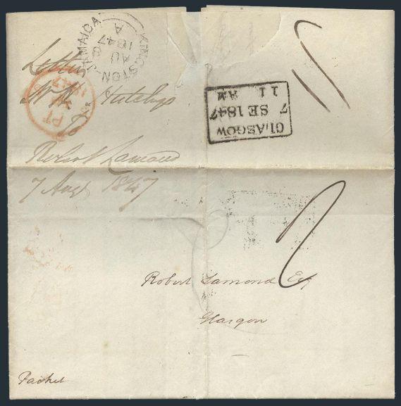 2764   imageStampless folded letter from Kingston, Jamaica 8 Aug, 1847 to Glasgow Scotland (rec b/s 7 Sept, 1847). Various markings. Letter inside deals with the death in Jamaica. F (Image) Estimate 75.00+ $Cdn