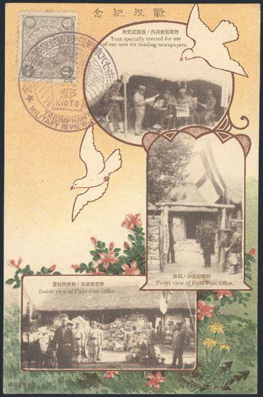 2775 92 image92 (8), Each tied by special illustrated Kioto / Triumphant Military Review 1906 cancel on the front of 8 diff colour illustrated Russo-Japanese War Patriotic postcards. Depict battle scenes, Artillery, Field Post Office, Royal Couple, etc. F-VF (Image) Estimate 175.00+ $Cdn