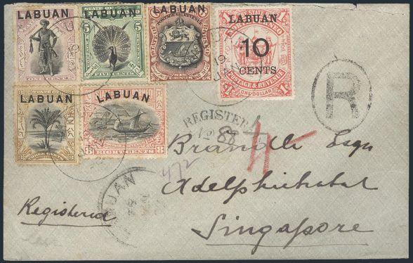 2821 59/79 image59/79, Six diff stamps neatly tied by Labuan 19 Jan, 1898 CDS's on Reg'd cover to Singapore (rec b/s 28 Jan, '98). Some perf toning otherwise VF. A SCARCE EARLY COVER (Image) Estimate 600.00+ $Cdn