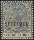 2824 35 image35, QV 5 Shilling with "SPECIMEN" overprint. VF, toned OG (Normal Cat $750 US) (Image) Estimate 175.00+ $Cdn