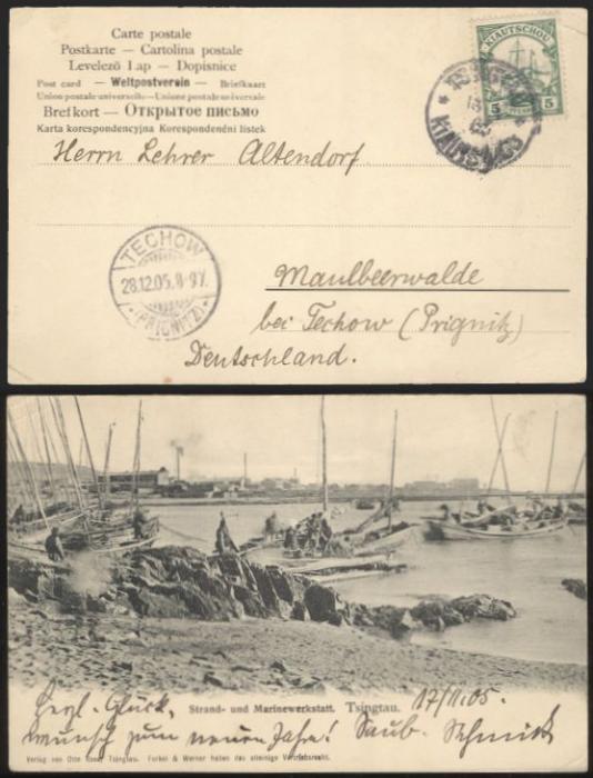 2810 11 image11, Tied by Tsingtau 13 Nov 1905 CDS on b/w postcard to Germany with Techow 28 Dec receiver. Card depicts watercraft at Tsingtau harbour. F-VF, corner crease. Attractive (Image) Estimate 50.00+ $Cdn