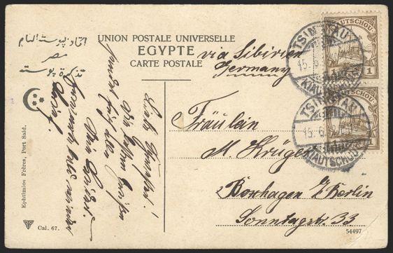 2811 33 image33 (Pair), Tied by Tsingtau 15 June 1912 CDS on postcard to Berlin. Card depicts village scene near Cairo, Egypt. F+, corner crease. Attractive (Image) Estimate 65.00+ $Cdn