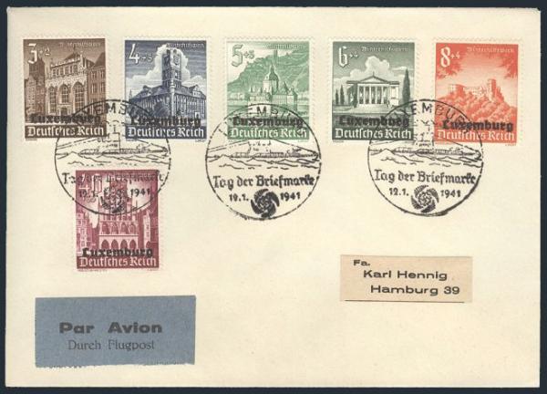 2924 NB1-9 imageNB1-9, Tied by Luxembourg U-Boat illustrated Stamp Day 12 Jan 1941 F.D. cancels on 2 Airmail covers to Hamburg. VF (2) (Image) Estimate 50.00+ $Cdn