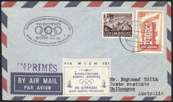 2915 319, C12 image319, C12, Tied on cach Austria to Australia Melbourne Olympics Nov 1956 flight cover addr to Melbourne. Has matching blue imperf label affixed & special Olympic receiver on back. VF (Image) Estimate 45.00+ $Cdn