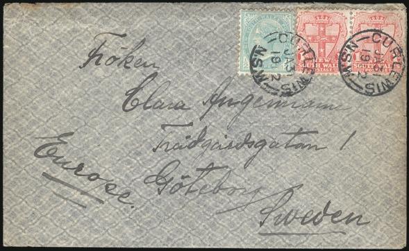 3148 121 image121, 122 (Pair), Tied by Curlewis, NSW 31 Jan 1912 CDS's on cover to Sweden with Goteborg 10 Mar 1913 b/s. Has original contents written in Swedish along with 15+ colourful BIRD FEATHERS. F, cover tear. Unusual (Image) Estimate 100.00+ $Cdn