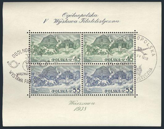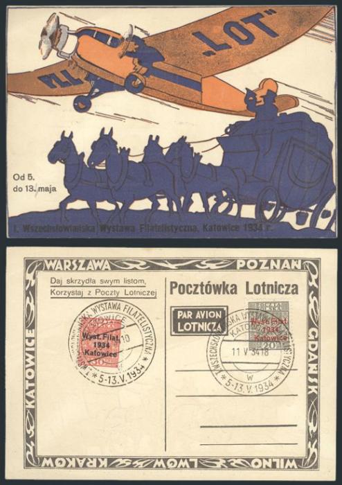 3279 280-1 image280-1, VF Katowice Philatelic Exhibition set neatly tied by May 1934 exhibition cancels on lovely colour illustrated postcard (depicting a "LOT" airplane and a mail coach). VF (Image) Estimate 125.00+ $Cdn