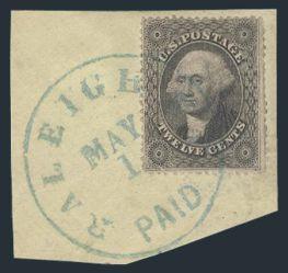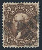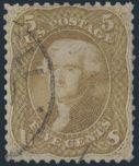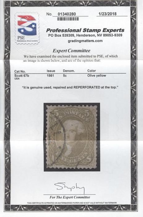 5¢ Olive Yellow, nice distinctive colour, beautiful centering, light CDS cancel. VF, expertly repaired / reperfed at top (per Certificate). Has 2018 PSE Certificate. Cat $4,850