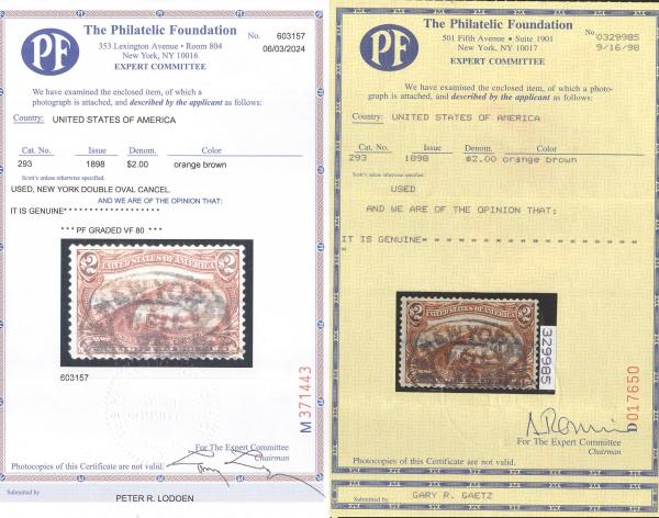 4081 293 image293, Attractive used $2 Trans-Mississippi. VF, neat New York double oval registry cancel. Has 1998 & 2024 Philatelic Foundation Certificates, the latter being graded VF 80 (Image) (View Certificate)