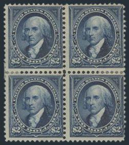 4076 262 image262, Scarce mint block of the $2 Madison. Immaculate colour, fresh, F, OG, some sensible perf reinforcement of a minor nature. A RARELY SEEN BLOCK. Cat $12,500 US (Image) Estimate 3,500.00+ $Cdn