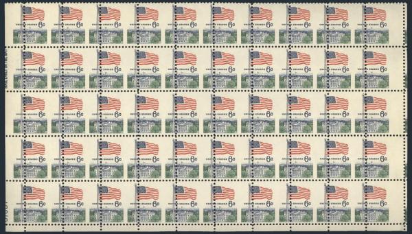 4122 1338 image1338, Half sheet of 50 of the 6¢ Flag with a MAJOR MISPERF ERROR & MISCUT (showing portions of next stamps at right). Has partial Plate Number & Mail Early imprints at left. VF, some DG. A PRETTY SHOWPIECE (Image) Estimate 325.00+ $Cdn