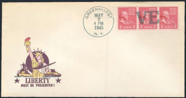 4109 806 image806, Strip of 3, With Greenhurst NY 7 May, 1945 "VE" DAY cancel in green on WWII patriotic cover. VF (Image) Estimate 50.00+ $Cdn